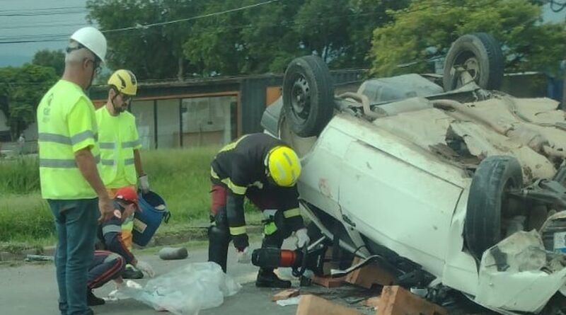 A imagem do local mostra claramente o carro capotado e os pertences do proprietário espalhados pela pista, evidenciando a violência do impacto.
