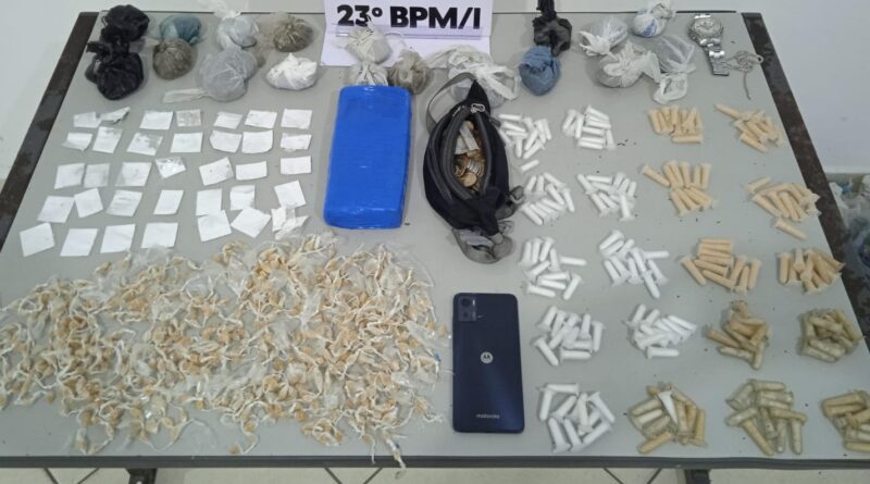 Na posse do suspeito, foram encontradas quantidades significativas de substâncias ilícitas, incluindo 200 eppendorfes com cocaína, 36 papelotes da mesma droga, 19 invólucros de maconha, além de 610 pedras de crack e um tijolo de maconha. O arsenal de drogas apreendido reflete a escala da operação de tráfico que estava sendo conduzida pelo indivíduo. Além das substâncias ilegais, um celular da marca Motorola e uma quantia de R$ 41,15 também foram apreendidos, potencialmente relacionados à atividade criminosa.