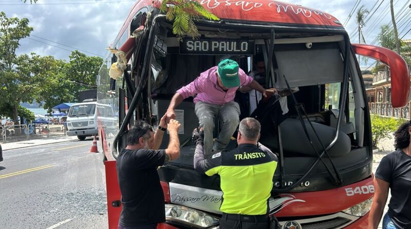 Ônibus colide com caminhão na Rio-Santos em São Sebastião; passageiros quebram janelas para sair
