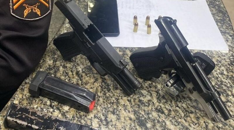 Os policiais faziam patrulhamento pela Rua Professor Haroldo Carvalho Cruz quando avistaram os suspeitos tentando se esconder atrás de veículos abandonados. Ao abordá-los, os agentes encontraram duas pistolas – uma calibre 9mm e outra calibre 380 –, três carregadores e 29 pinos de cocaína, totalizando 38 gramas da droga.