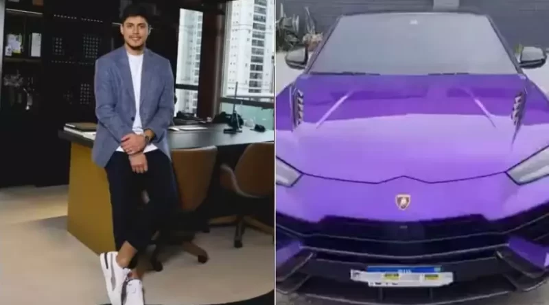 Rodrigo e a Lamborghini roxa apreendida pela PF