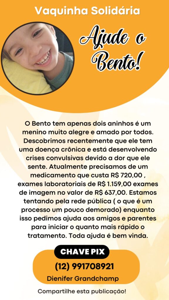 Com apenas dois aninhos de idade, o pequeno Bento já enfrenta uma batalha desafiadora. Alegre, carismático e muito amado por todos que o conhecem, ele foi recentemente diagnosticado com uma doença crônica que tem provocado crises convulsivas intensas, causadas pelas dores que sente.