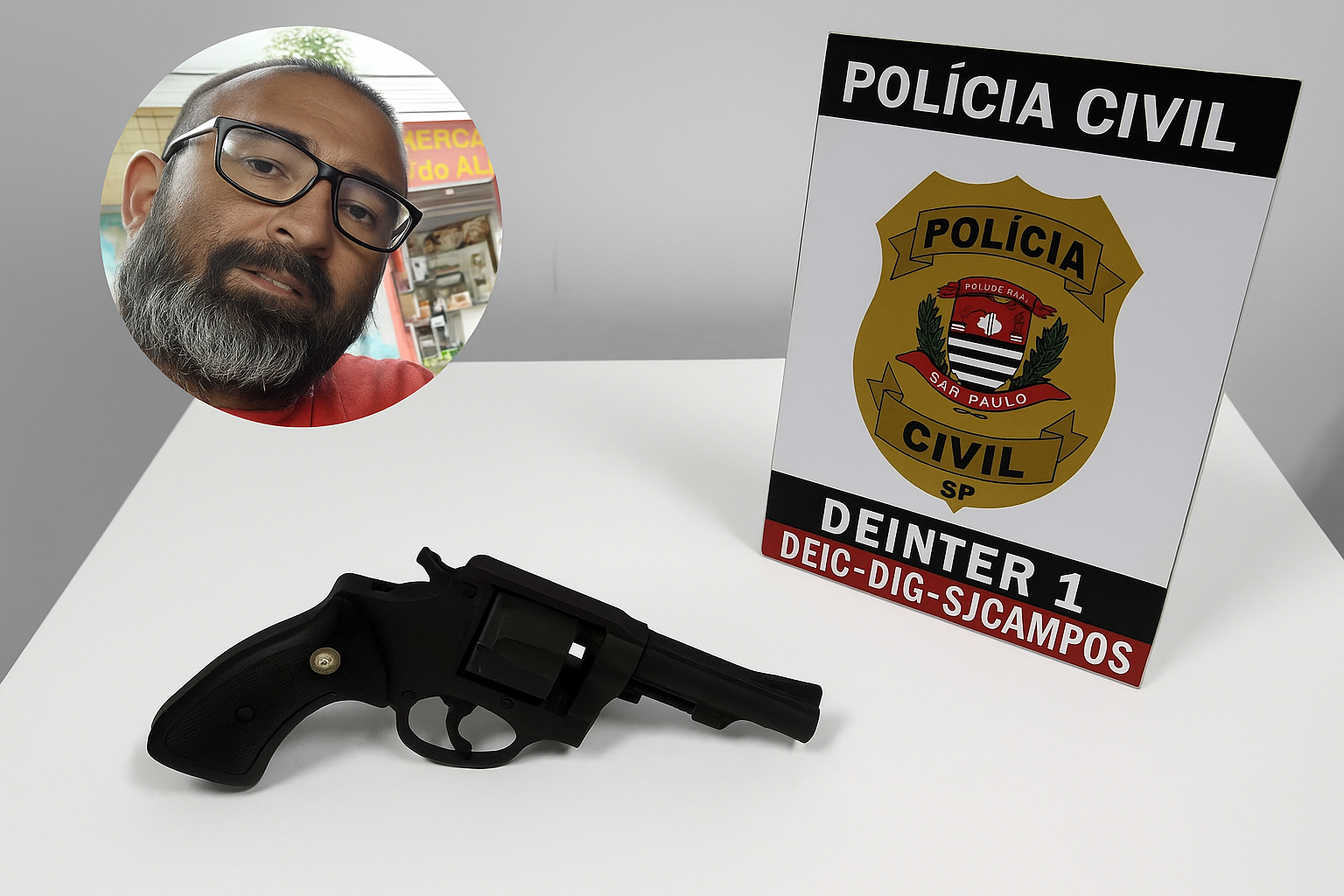 Arma apreendida pela Polícia Civil de São José dos Campos pode ter sido usada no latrocínio que vitimou o mecânico Marcilio Aparecido Severiano (detalhe).