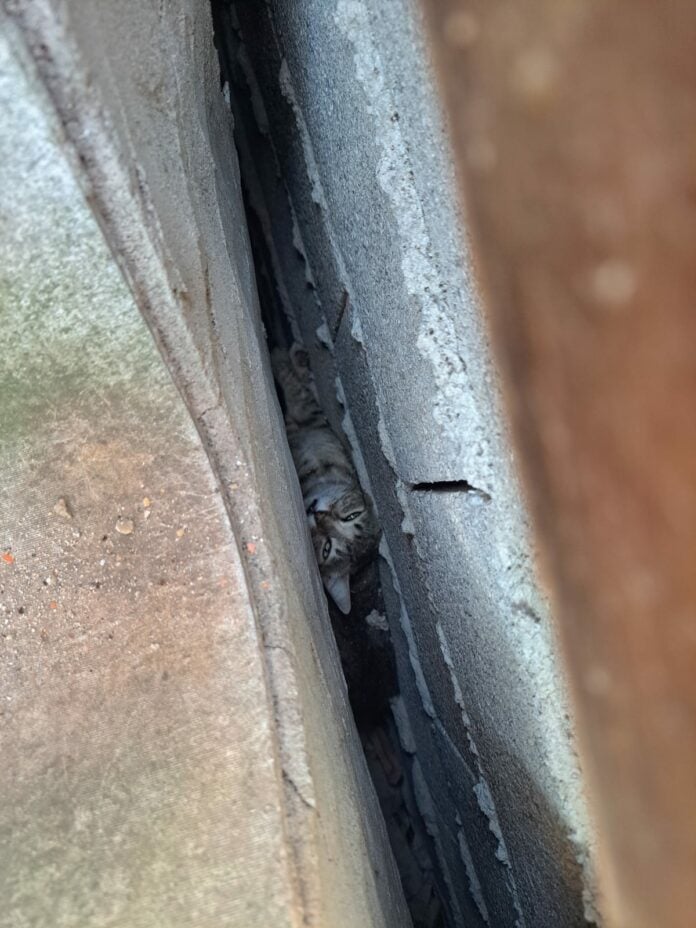 Segundo os moradores da casa, o felino havia desaparecido pela manhã, e após horas de procura pelos cômodos e arredores, seus tutores começaram a escutar miados abafados. Foi então que perceberam que o animal estava encurralado entre duas paredes, em um vão extremamente estreito, onde mal conseguia se mover.