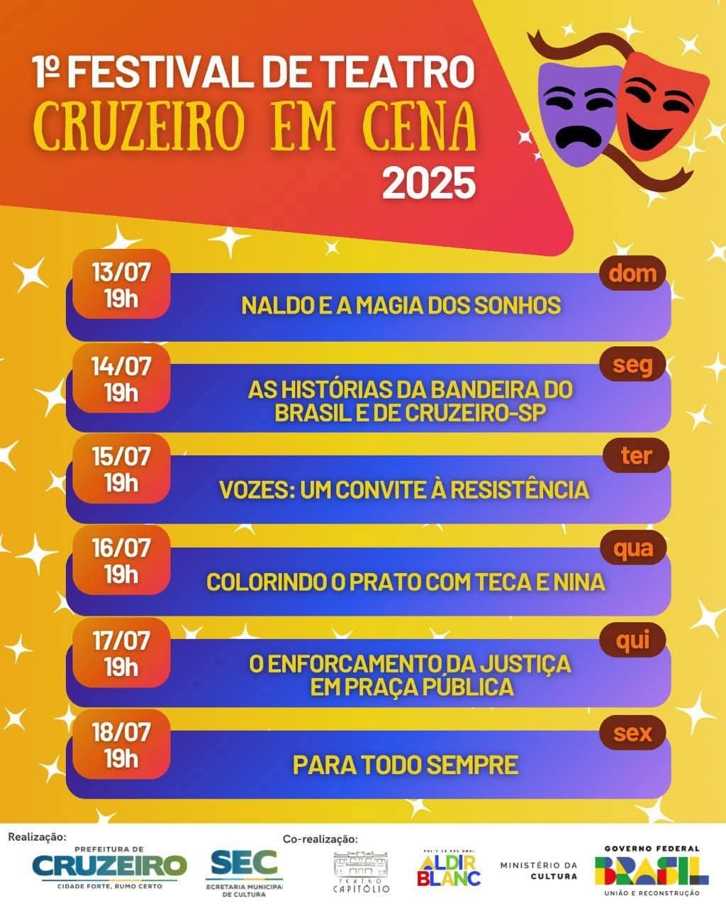 “O Cruzeiro em Cena nasce do diálogo com os grupos de teatro da cidade. É um festival construído a muitas mãos, com olhares diversos, vozes múltiplas e a certeza de que a arte feita aqui tem muito a dizer. Essa primeira edição é um marco e abre caminho para que o festival cresça ainda mais nos próximos anos”, declarou.