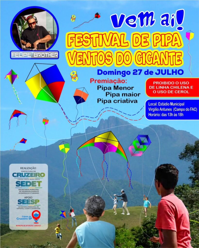 Pipeiros de prontidão, preparem suas pipas! As férias de julho terão um espetáculo nos céus de Cruzeiro com o aguardado Festival de Pipa Ventos do Gigante, que acontecerá no domingo, 27 de julho, no Estádio Municipal Virgílio Antunes (Campo do FAC), das 13h às 18h. O evento é uma realização da Prefeitura de Cruzeiro, por meio da Secretaria Municipal de Desenvolvimento Econômico e Turismo (SEDET), com apoio da Secretaria de Esporte, Lazer e Juventude (SEESP).