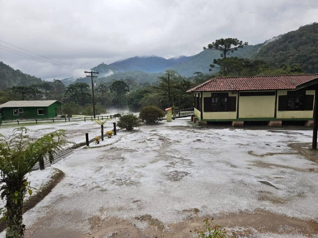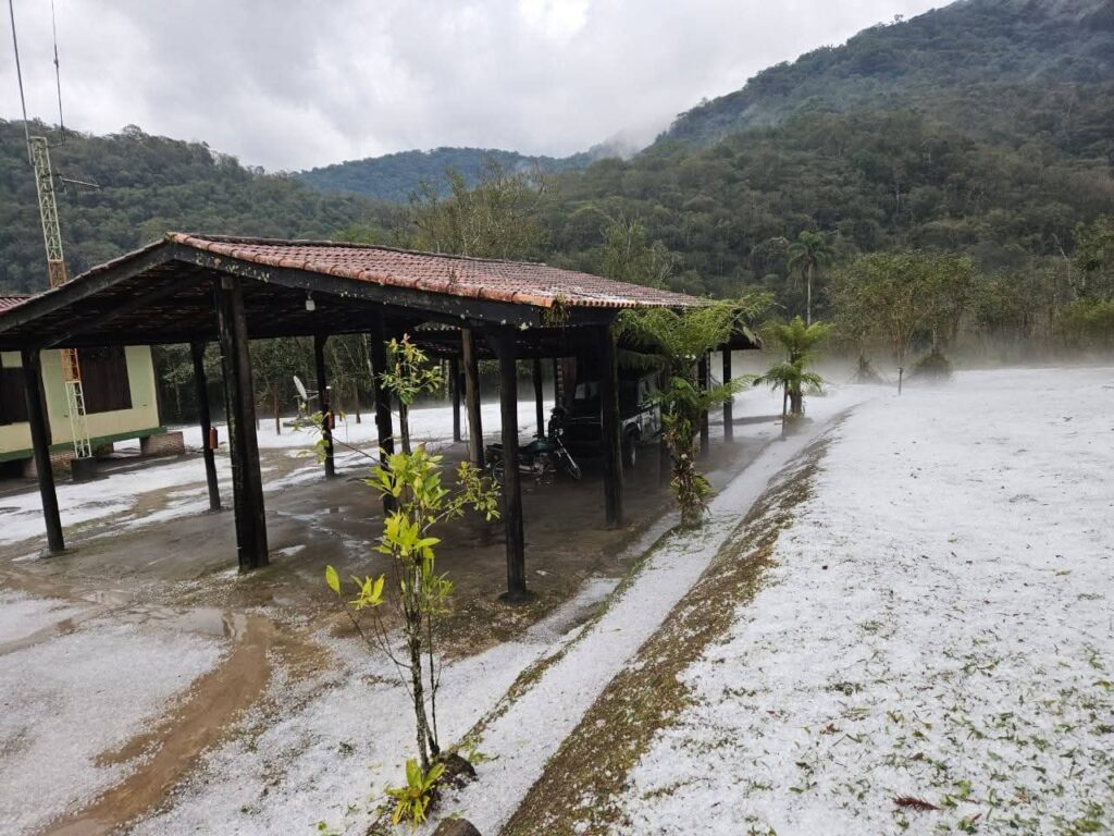 Imagens feitas por moradores mostram a situação da Estação Ecológica de Bananal logo após o temporal, com o solo coberto de granizo e vegetação danificada.
