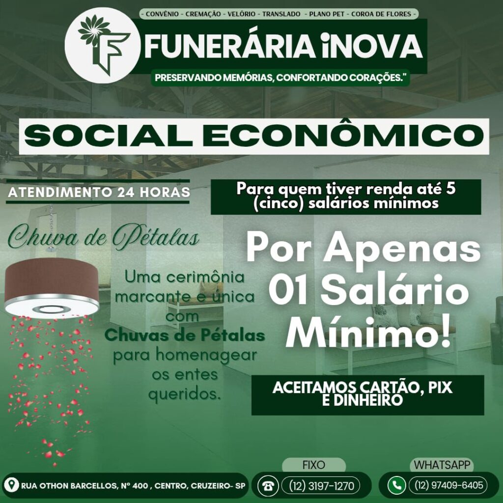 Na hora da despedida, cada gesto carrega um significado eterno. Pensando nas famílias que desejam se despedir com respeito, sensibilidade e um toque de amor, a Funerária iNOVA, em Cruzeiro (SP), apresenta o plano Social Econômico, que oferece um velório completo com homenagem especial — incluindo a emocionante chuva de pétalas — por apenas um salário mínimo.