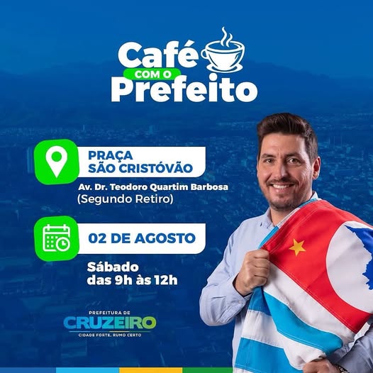 A Prefeitura de Cruzeiro realiza neste sábado, 2 de agosto, a próxima edição do Café com o Prefeito, projeto que aproxima a administração municipal da população por meio de encontros nos bairros. Desta vez, o evento será realizado na Praça São Cristóvão, no bairro II Retiro, a partir das 9h.