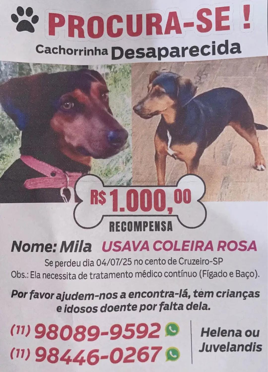 O cartaz espalhado pelas ruas e pelas redes oferece uma recompensa de R$ 1.000,00 a quem ajudar no resgate da cadelinha. Mas o valor é simbólico diante da urgência: Mila necessita de tratamento médico contínuo, pois sofre de problemas no fígado e no baço. Cada dia longe de casa representa um risco à sua vida.