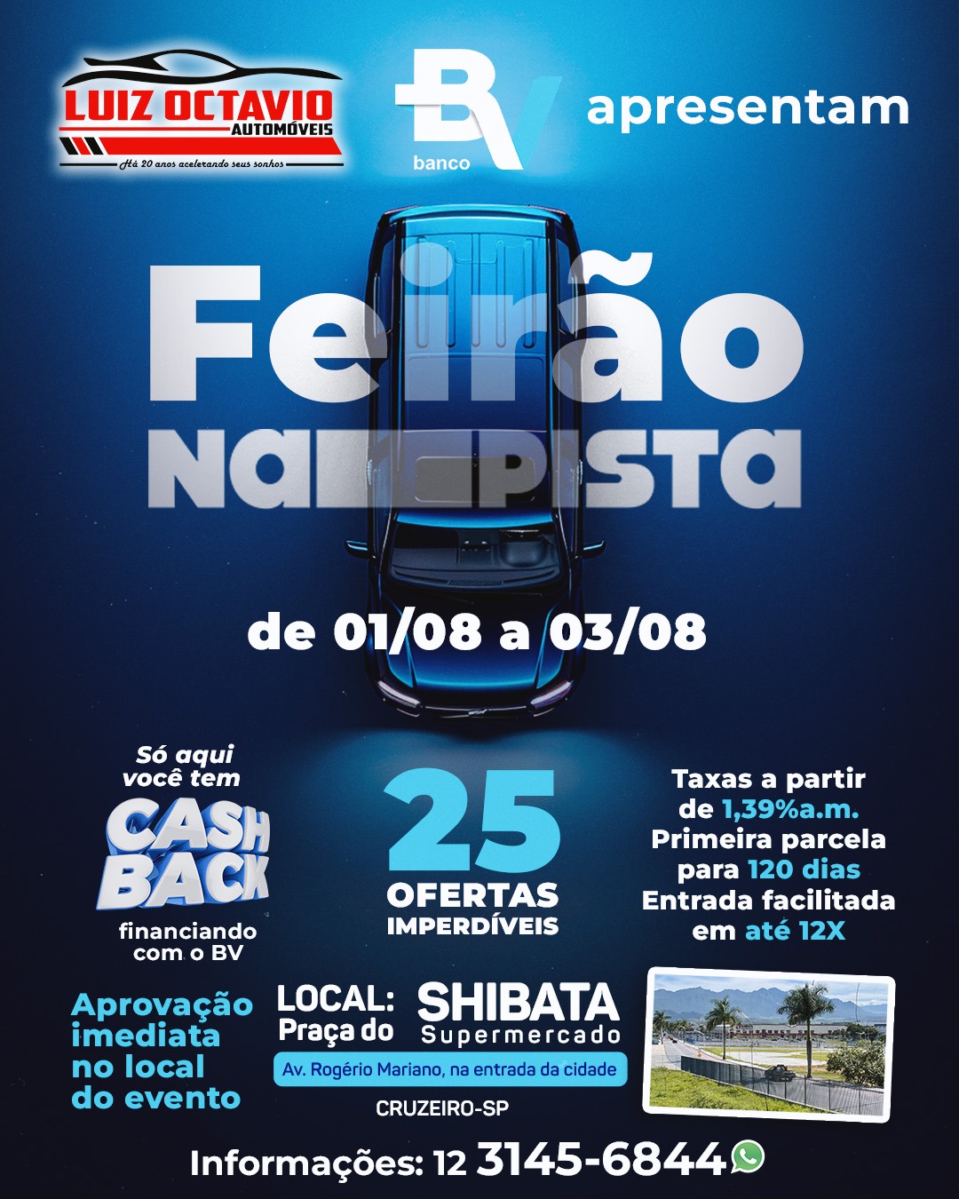 Prepare-se para três dias de ofertas inacreditáveis no maior feirão automotivo da região! De 1º a 3 de agosto, a Praça do Shibata, na Av. Rogério Mariano, S/N, será o ponto de partida para você realizar o sonho do carro novo ou seminovo com as melhores condições do mercado!