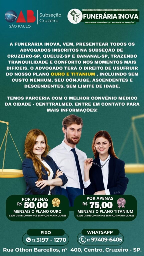 A Funerária iNOVA, reconhecida por sua atuação humanizada e eficiente em momentos de dor e despedida, firmou uma parceria de grande relevância com a Ordem dos Advogados do Brasil (OAB), subseção de Cruzeiro-SP, Queluz-SP e Bananal-SP. O convênio, voltado exclusivamente aos advogados inscritos nessas regiões, é um marco de confiança mútua entre duas instituições que prezam pela ética, seriedade e compromisso com a vida e a dignidade humana.