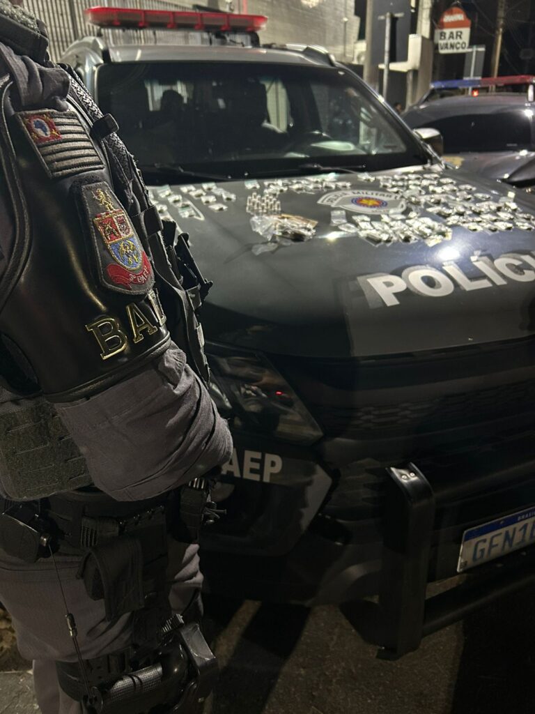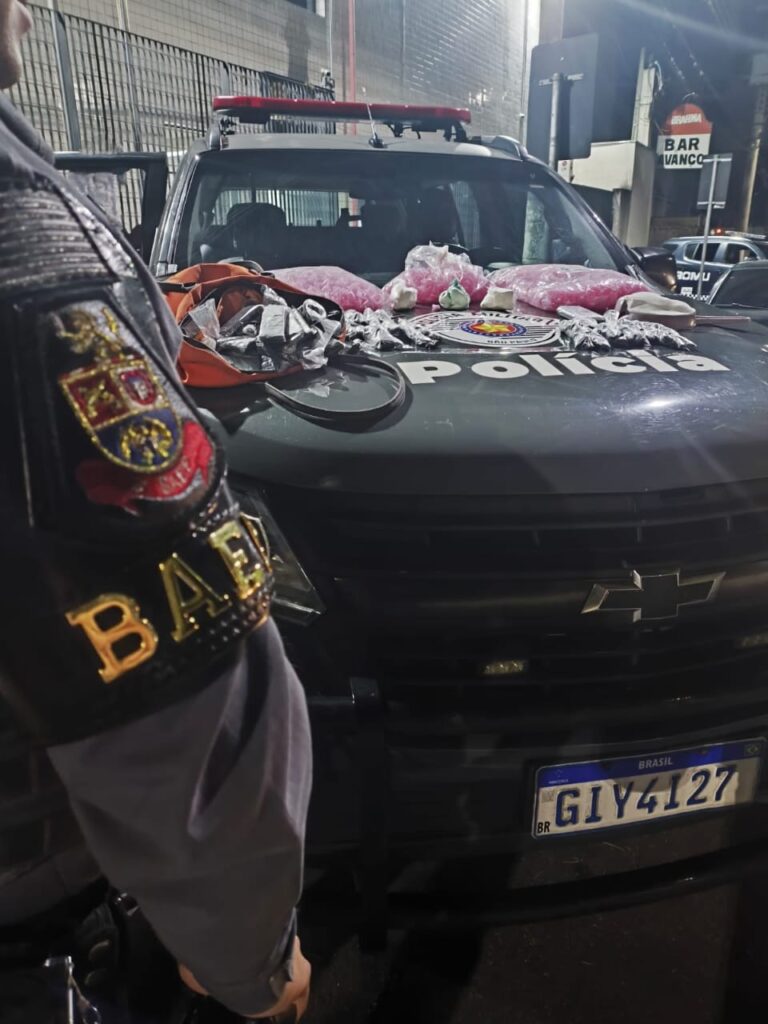 O criminoso resistiu ativamente, sendo contido com uso moderado da força. Na sacola havia 105 pinos de cocaína, 93 porções de maconha, 30 microtubos de crack e dois rádios comunicadores.
