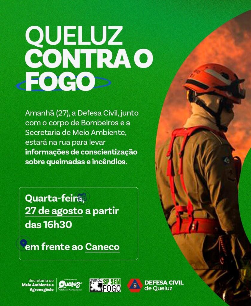 A cidade de Queluz se prepara para uma importante mobilização voltada à conscientização contra queimadas e incêndios, problema que afeta diretamente o meio ambiente e a qualidade de vida da população. Nesta quarta-feira, 27 de agosto, a Defesa Civil, em parceria com o Corpo de Bombeiros e a Secretaria de Meio Ambiente, estará em frente ao Caneco, a partir das 16h30, para levar informações, orientações e distribuir materiais educativos sobre os riscos e prejuízos provocados pelo fogo.