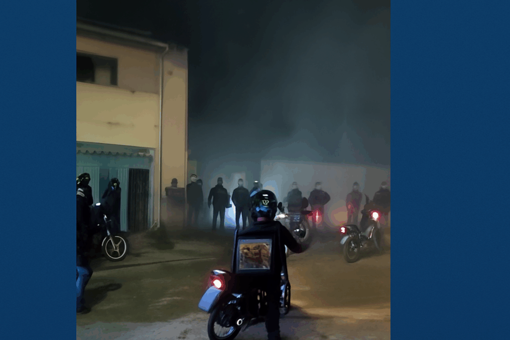 Horas depois, dezenas de motoboys cercaram a casa do cliente. As imagens viralizadas mostram o portão sendo derrubado, pedras e fogos de artifício sendo lançados contra a residência, além de uma pequena bomba atirada no quintal. O carro e a cobertura da garagem foram danificados, e três bicicletas foram furtadas. Alguns motociclistas chegaram a cobrir as placas com sacolas plásticas.