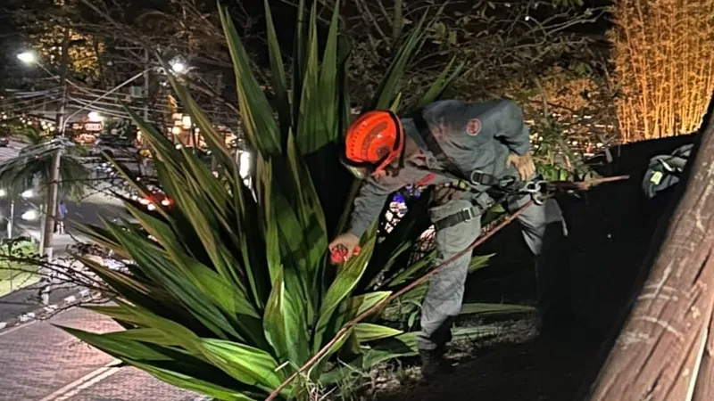 Durante a aproximação, o gato, já bastante estressado com a situação, correu em direção a um bambuzal próximo, tornando o trabalho ainda mais complexo. O terreno irregular, a altura e a fuga inesperada exigiram esforço redobrado da equipe. Foram necessárias várias tentativas de aproximação até que finalmente o felino pôde ser contido de forma segura.