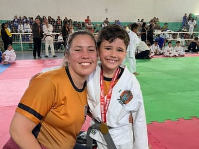 Sensei Fernanda Fontes e o judoca mirim Lucas de Freitas Junqueira, campeão em sua categoria no 1º Torneio Solidário de Judô, realizado em Lavrinhas