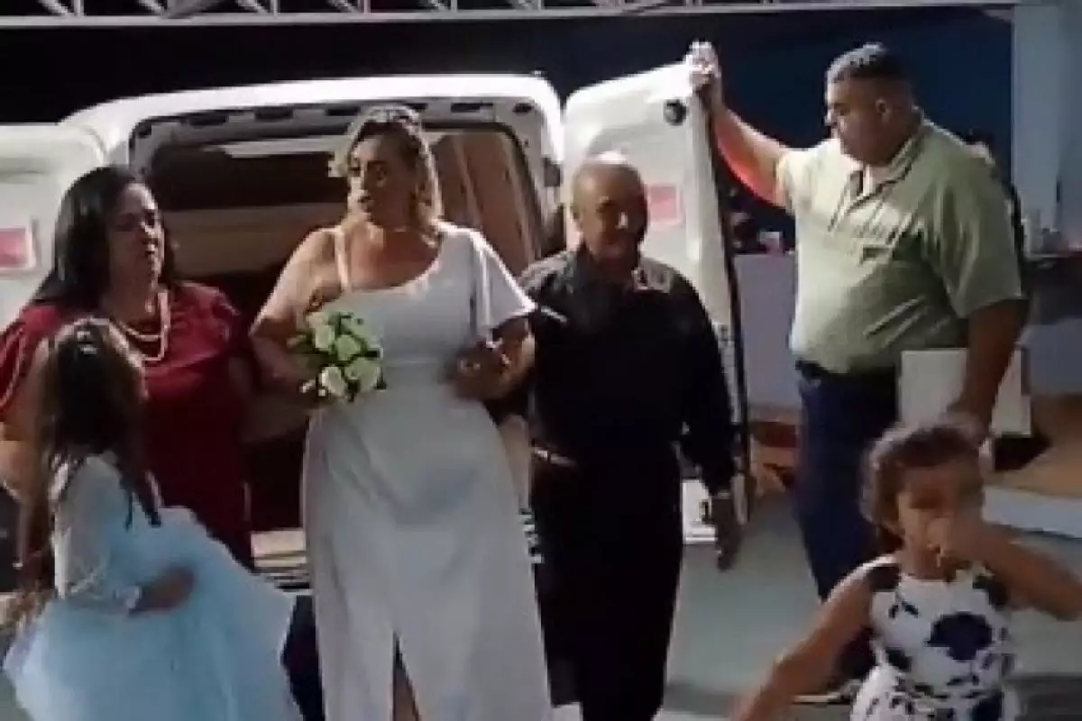 Logo depois, Darlete desceu da traseira da Fiorino, sentada em um pequeno sofá, vestida de noiva e com maquiagem impecável. A cena causou espanto e arrancou risadas e aplausos dos presentes.