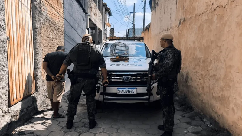 A equipe deslocou-se até uma residência para averiguar uma denúncia de manutenção irregular de ave silvestre em cativeiro. Ao chegarem ao local, os policiais foram recebidos pelo morador e realizaram uma vistoria minuciosa no imóvel. Durante a fiscalização, a denúncia foi confirmada: no interior da casa havia um canário-da-terra, espécie nativa da fauna brasileira, mantido em uma gaiola sem autorização dos órgãos ambientais competentes.