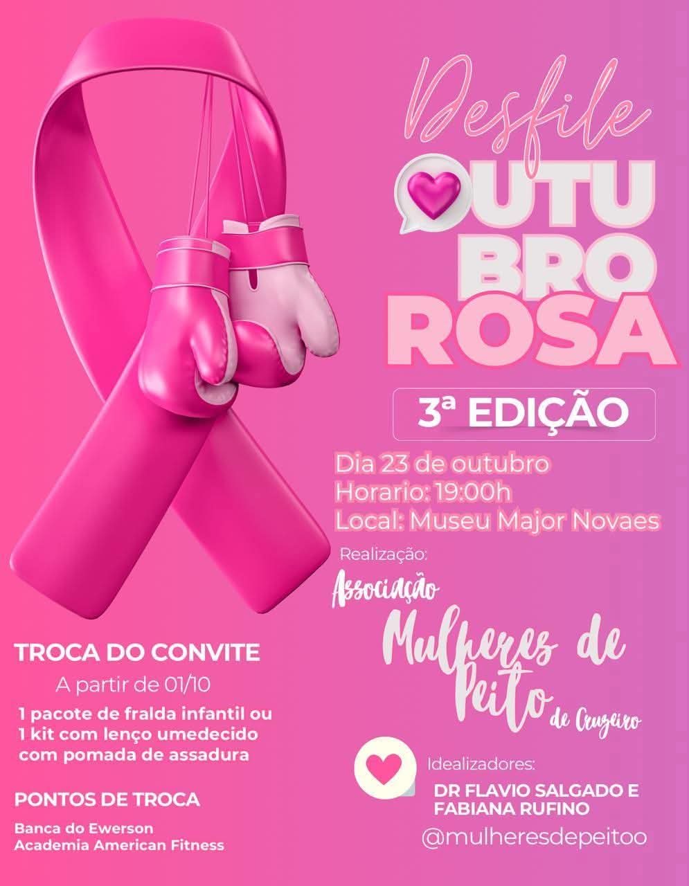 A cidade de Cruzeiro se une mais uma vez à campanha Outubro Rosa com a realização da 3ª edição do Desfile Outubro Rosa, promovido pela Associação Mulheres de Peito de Cruzeiro. O evento acontece no dia 23 de outubro, a partir das 19h, no Museu Major Novaes, reunindo mulheres que venceram ou enfrentam o câncer de mama em um momento de emoção, beleza e conscientização.