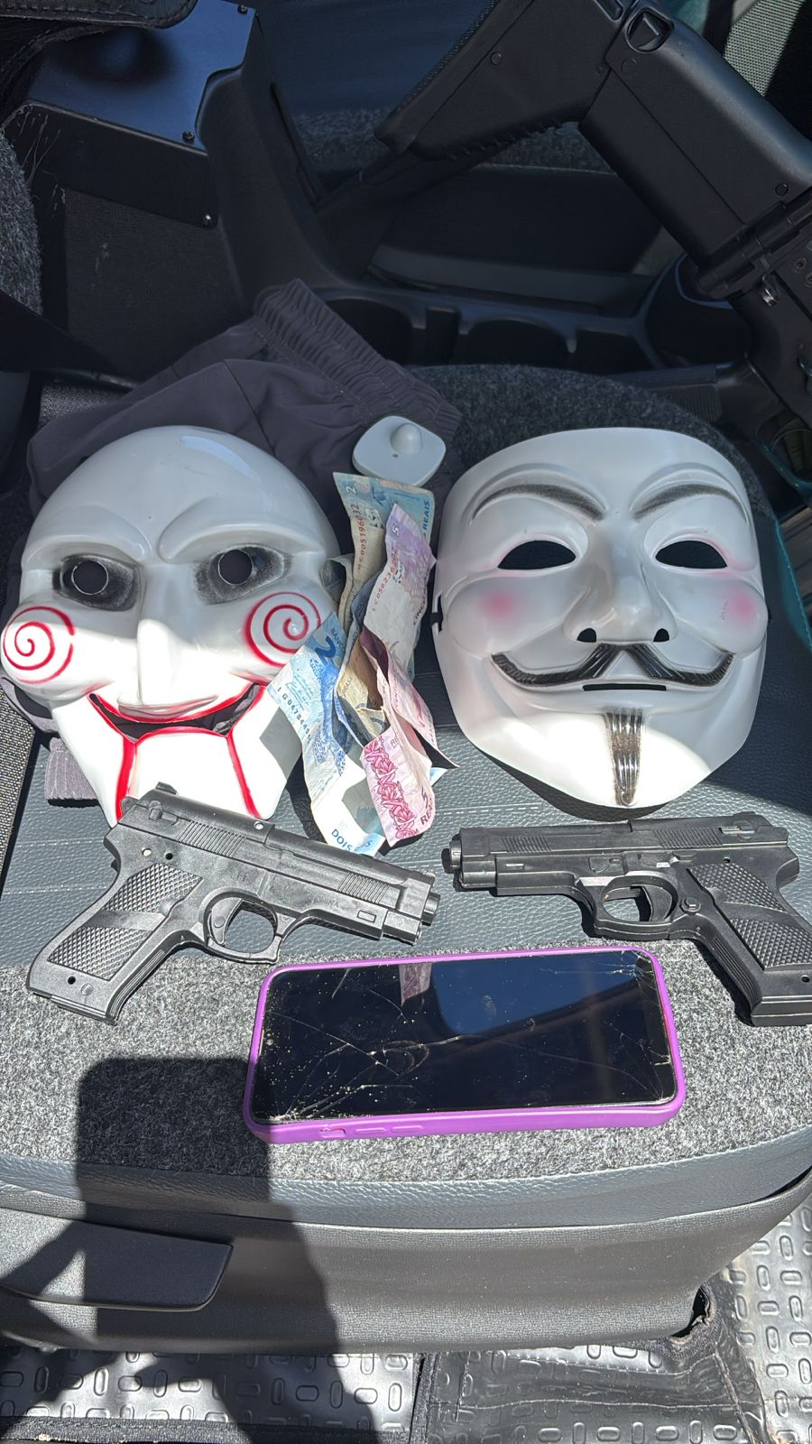Durante a revista, nada de ilícito foi encontrado com os suspeitos. Porém, em um ato de confissão involuntária, um deles acabou contando onde havia deixado a sacola com simulacros de arma de fogo e as máscaras utilizadas no crime. O material foi localizado e apreendido, encerrando a sequência criminosa com final feliz para a população e a polícia.