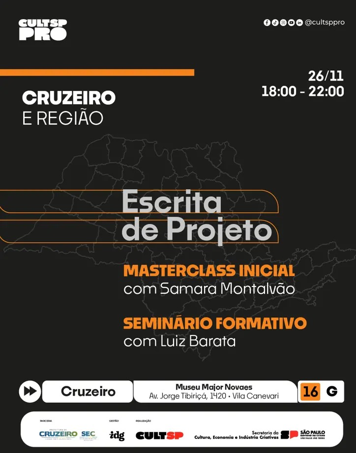Cruzeiro se prepara para uma noite de imersão cultural com a chegada da oficina “Escrita de Projeto”, etapa do programa CULTSP PRO – Escolas de Profissionais da Cultura, que reforça a qualificação e o protagonismo do setor criativo no estado. O encontro acontece nesta terça-feira, das 18h às 22h, no Museu Major Novaes, na Avenida Jorge Tibiriçá, nº 1.420, Vila Canevari, e promete movimentar artistas, produtores e gestores culturais de toda a região.