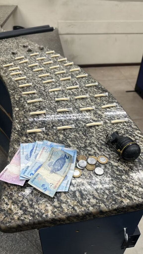 Durante a revista, os agentes encontraram dentro da sacola uma granada, além de sete trouxinhas de maconha, 39 cápsulas de cocaína e R$ 19,75 em dinheiro. A apreensão do artefato explosivo causou preocupação, uma vez que se trata de um objeto com alto poder destrutivo, capaz de colocar em risco a vida de moradores, policiais e de toda a vizinhança.