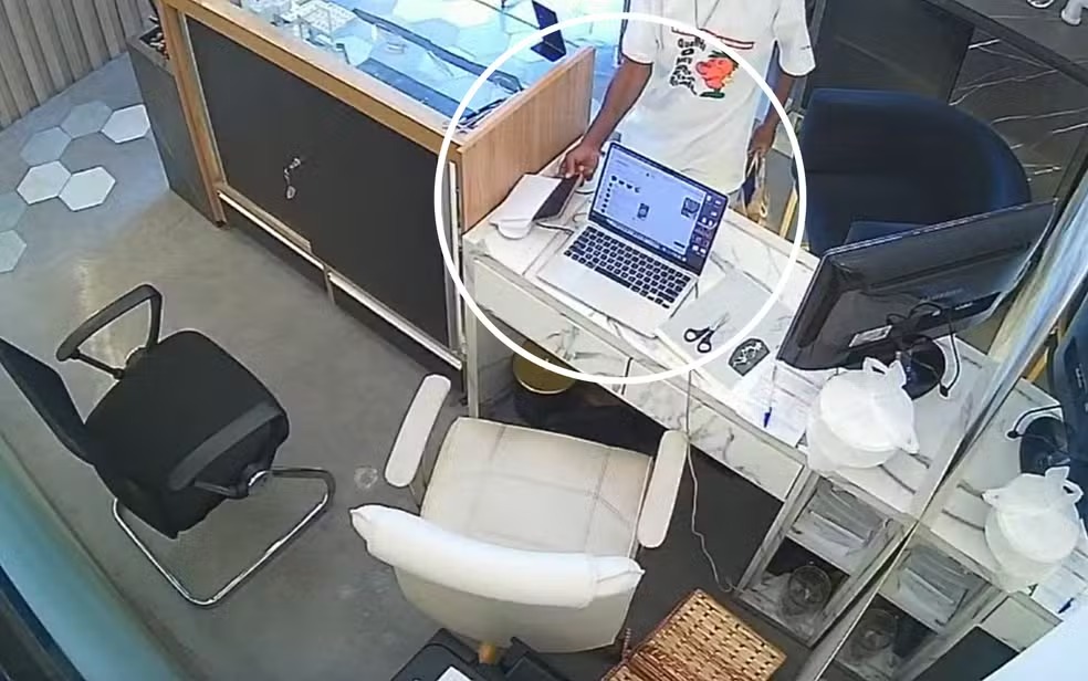 As câmeras de segurança registraram o momento em que o suspeito, em versão cliente ligeiro, aproveita um descuido e pega o aparelho de uma mulher de 29 anos. Tudo muito rápido, quase artístico. Só faltou enquadrar e pedir filtro. Depois da obra, ele deixa o local como quem não quer nada.