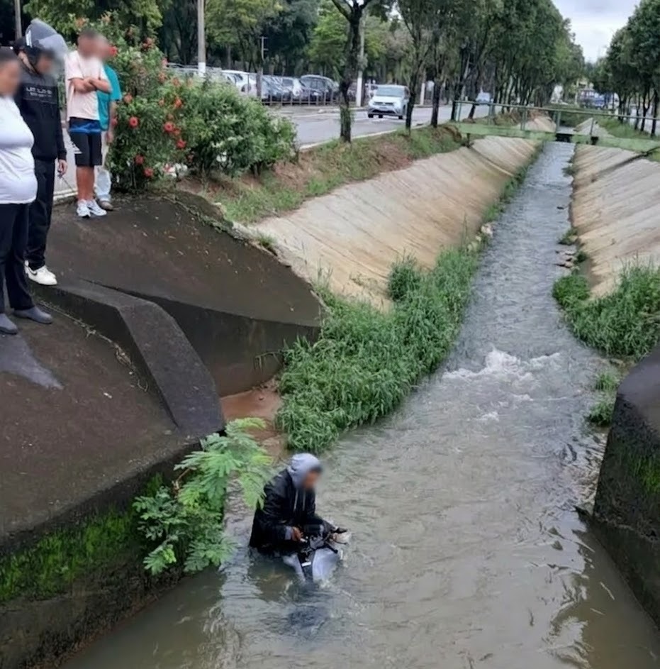 Com o impacto da batida, o motociclista mais jovem perdeu o controle da motocicleta e acabou sendo lançado para dentro do córrego Manoel Ito. A queda chamou a atenção de pessoas que passavam pelo local e de trabalhadores que realizavam obras nas proximidades. Apesar do susto, o homem foi retirado do interior do córrego e apresentava apenas escoriações leves.