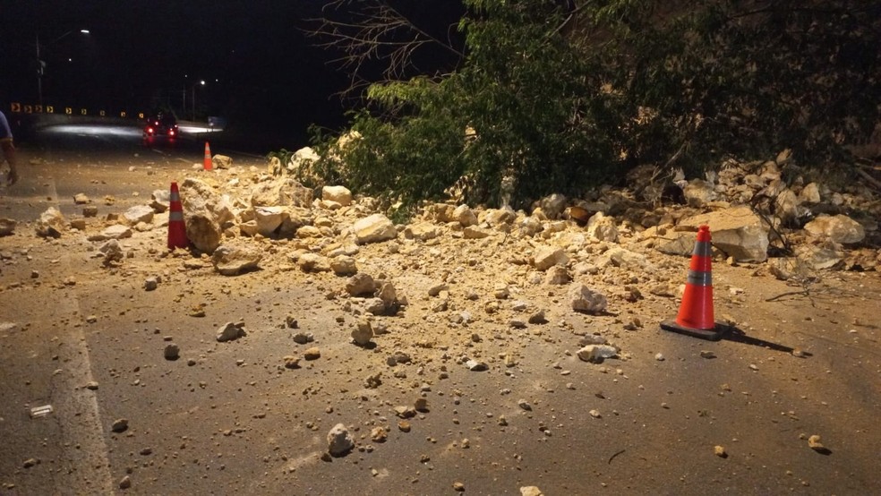 Um deslizamento de rochas provocou a interdição parcial da Rodovia dos Tamoios (SP-099), na altura do km 81, em Caraguatatuba, durante a madrugada desta sexta-feira (13).