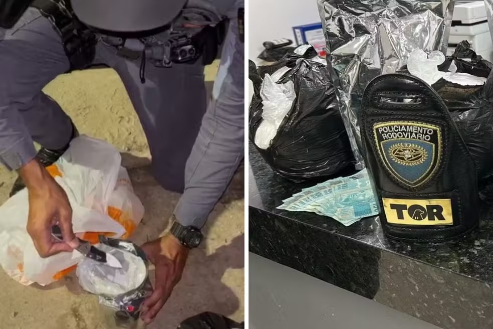 No assoalho do lado do passageiro, os agentes encontraram uma sacola contendo diversos tabletes de cocaína. A quantidade, aproximadamente 8 quilos, caracteriza tráfico e chamou a atenção pela forma como estava escondida.