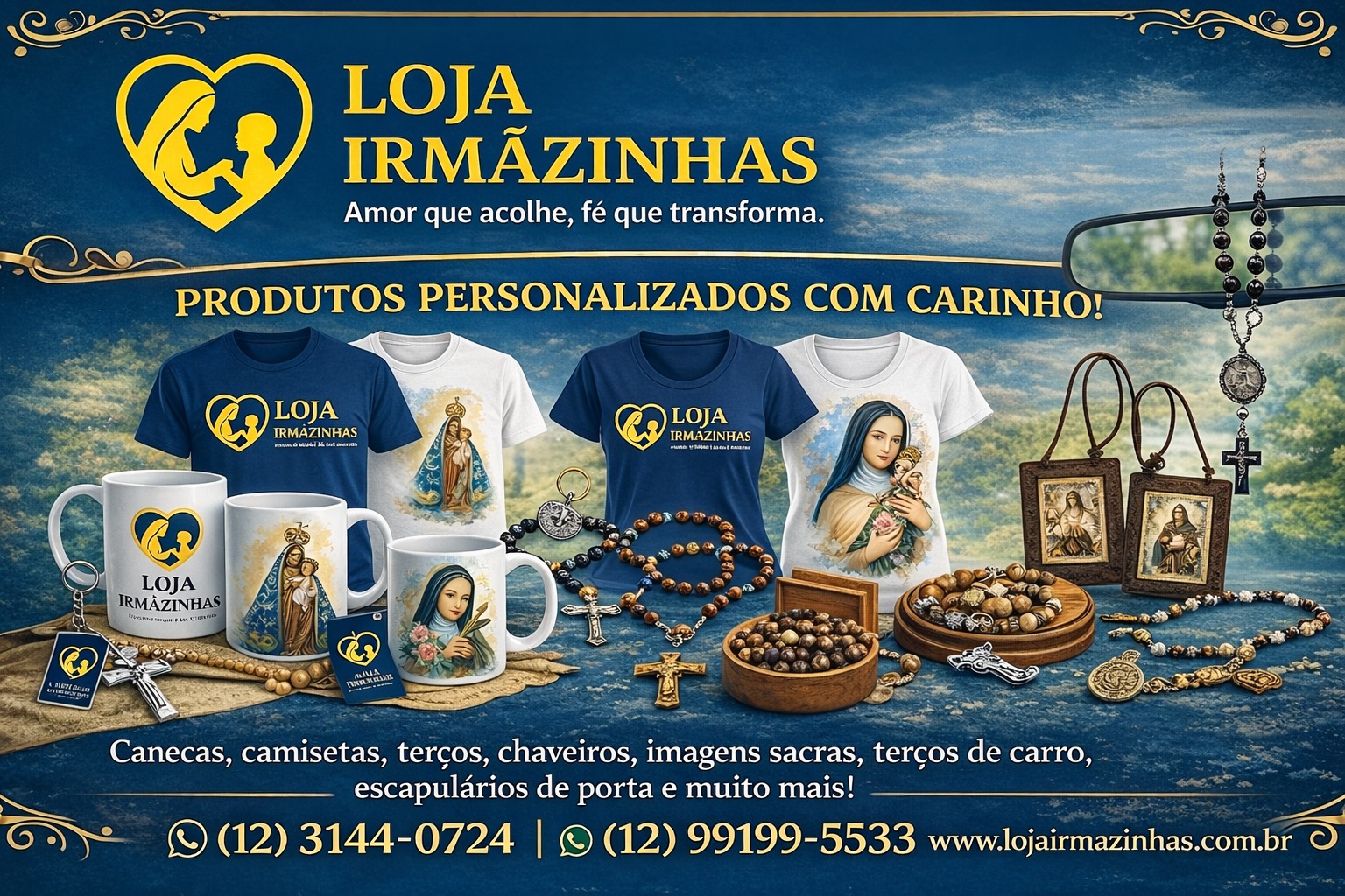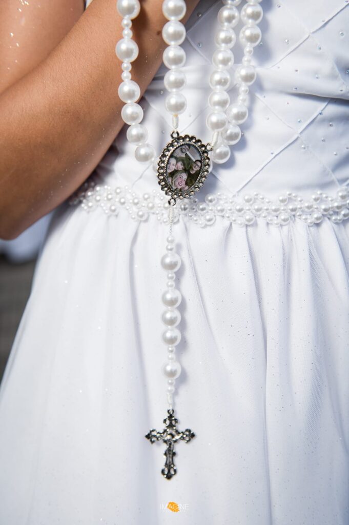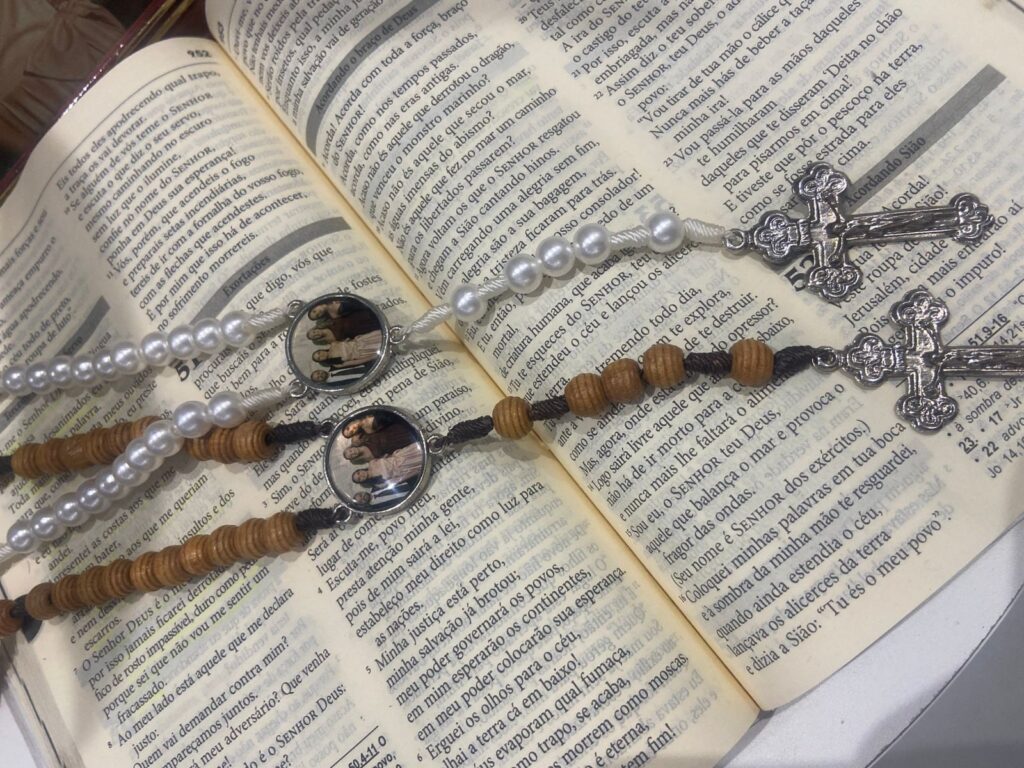 Entre os itens, os terços personalizados vêm ganhando destaque. Eles podem ser produzidos especialmente para casamentos ou com imagens de família, além da possibilidade de incluir nomes, transformando cada peça em algo único, carregado de significado e devoção.