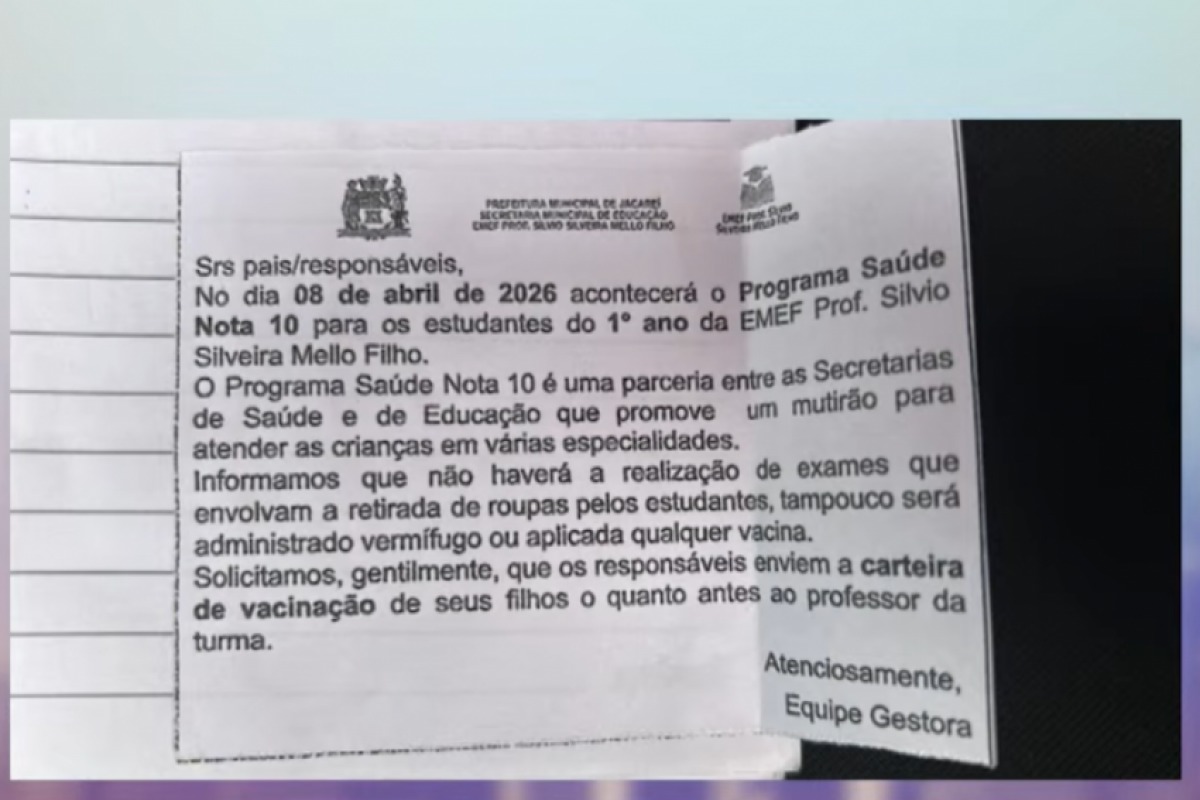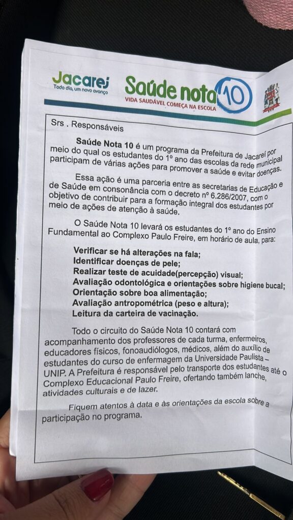 A Prefeitura de Jacareí explicou que o “Saúde Nota Dez”, ativo há 13 anos, visa detectar e prevenir doenças em alunos da rede municipal, com sucessos em tratamentos. O circuito de salas inclui avaliações por profissionais de saúde, e a remoção do uniforme é essencial para exames dermatológicos e clínicos.