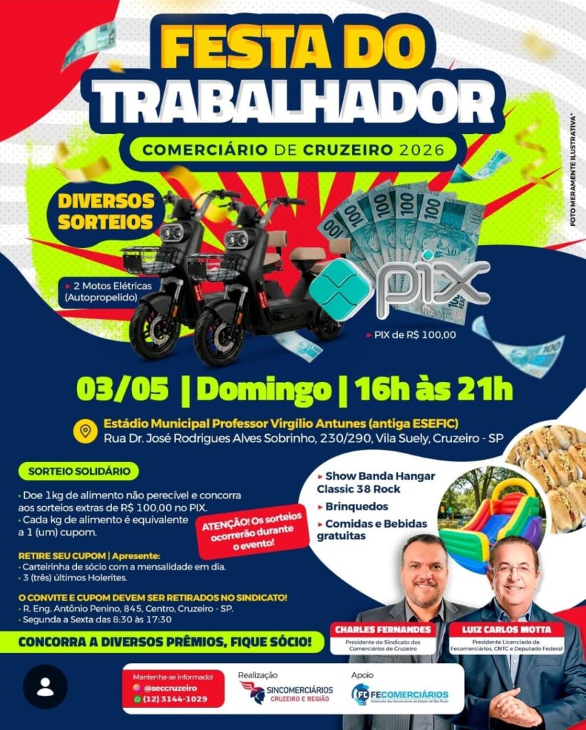 Com estrutura, premiações atrativas e uma programação completa, a Festa do Trabalhador Comerciário de Cruzeiro 2026 promete ser uma das maiores edições já realizadas, consolidando-se como um marco de celebração, solidariedade e valorização da classe trabalhadora.